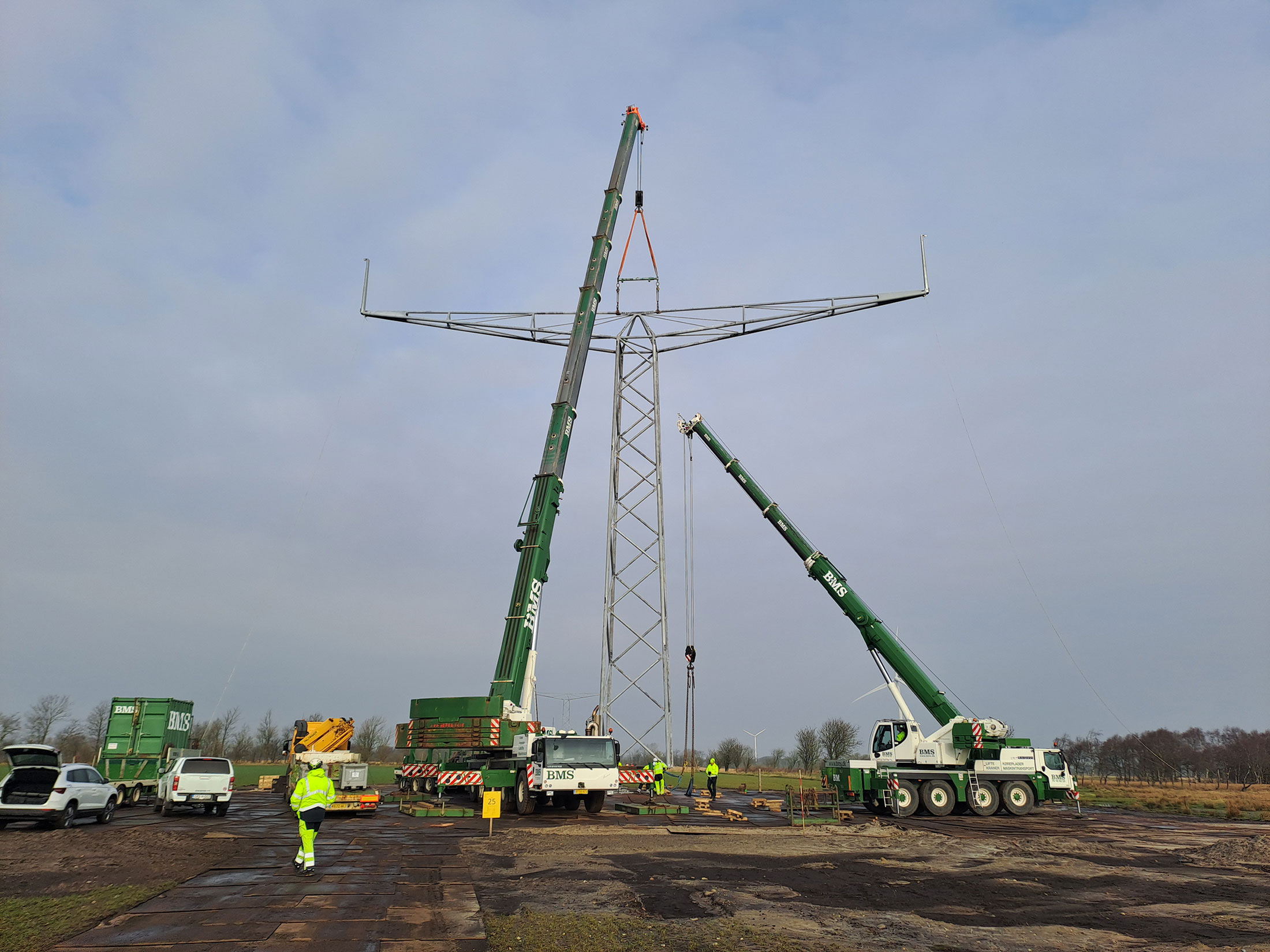 Rad na postavljanju stubova zahtijeva precizno planiranje i logistiku – svaki stub mora biti sastavljen na zemlji od 71 pojedinačnog dijela prije podizanja. S obzirom na visinu do 40 metara i težinu do 55 tona, potrebna je specijalizovana oprema za montažu.